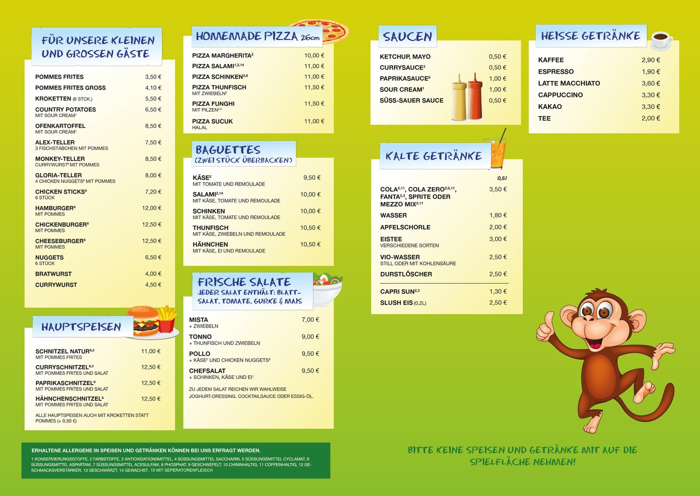 Spielen macht bekanntlich hungrig und durstig, darum bieten wir in unserem Monkey-Bistro zu Familien freundlichen Preisen leckere Snacks wie selbstgemachte Pizza, Pommes, Chicken Nuggets und vieles mehr sowie Kaltgetränke und Eis. Neben Durstlöschern gibt es natürlich auch warme Getränke für die Erwachsenen wie Kaffee, Latte Macchiato, Milchkaffee, Tee oder Kakao. Für jeden Geschmack ist garantiert etwas dabei.